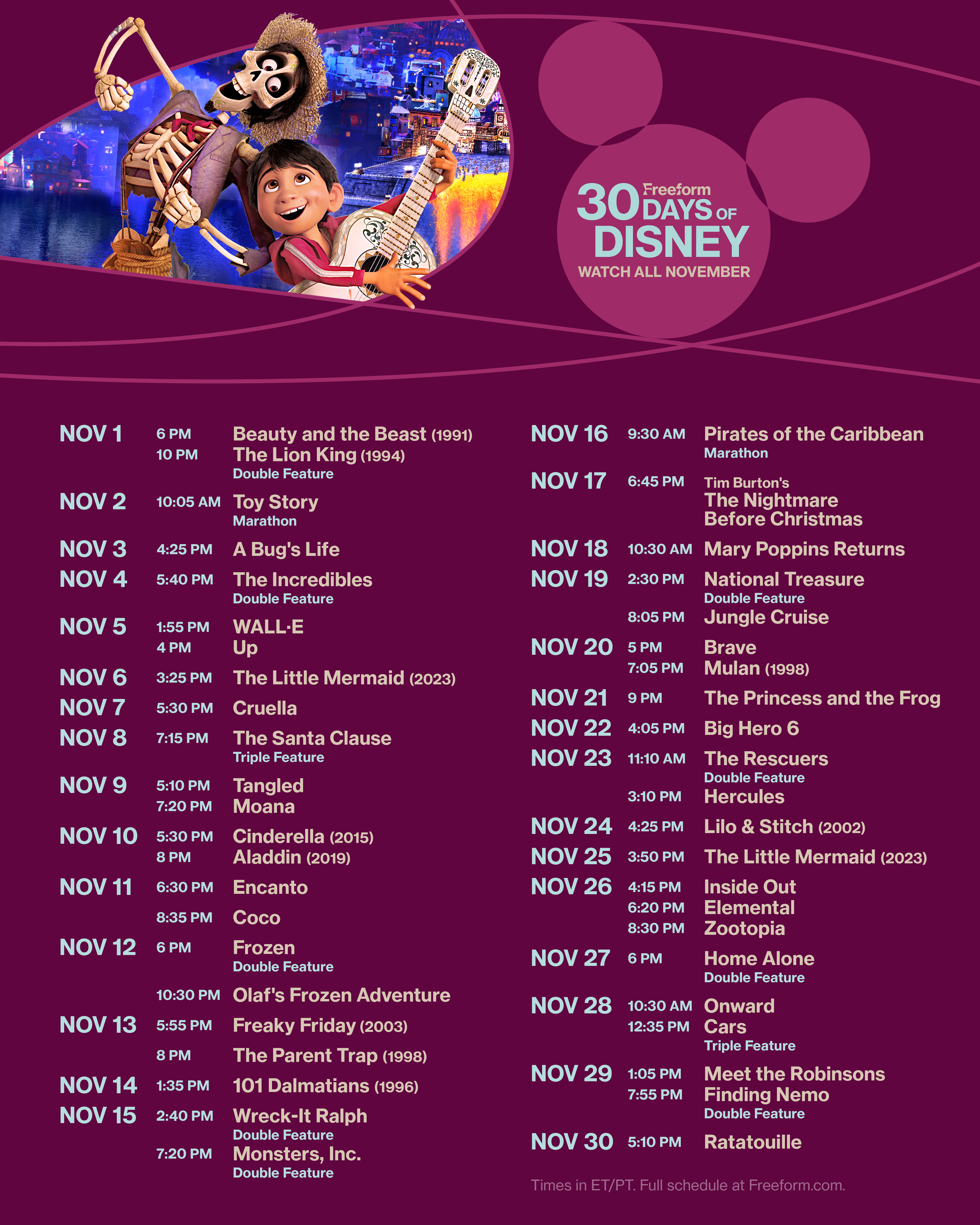 The Disney marathon you've been waiting for is here! Grab some hot cocoa, cozy up with a blanket and get ready to fall into Freeform's "30 Days of Disney" with a monthlong celebration full of Disney nostalgic classics and modern hits. Have the tiaras and crowns at the ready while watching "happily ever after" moments with films like "Cinderella" (1950), "Sleeping Beauty" (1959), "Beauty and the Beast" (1991), Snow White and the Seven Dwarfs" (1937) and more. Dive into action-packed adventures with titles like "Robin Hood" (1973), "The Jungle Book" (2016) and a "Pirates of the Caribbean" movie marathon. 'Tis the season for holiday titles like "Dr. Seuss' How The Grinch Stole Christmas," "Jingle All The Way," "Home Alone" and marathons of "The Santa Clause." Settle in for the monthlong celebration with the Freeform premiere "The Sword and the Stone" (Disney Animated) and a Disney-Pixar marathon of "Ratatouille," "A Bug's Life," "Coco," "Up" and more. Last November's event reached nearly 25 million viewers. Freeform ranked as the No. 1 cable entertainment network with P18-34 and F18-34, with Top 5 placements across F18-49 (No. 3), P18-49 (No. 4) and M18-34 (No. 5).* Below is a night-by-night list of the movies airing during "30 Days of Disney":